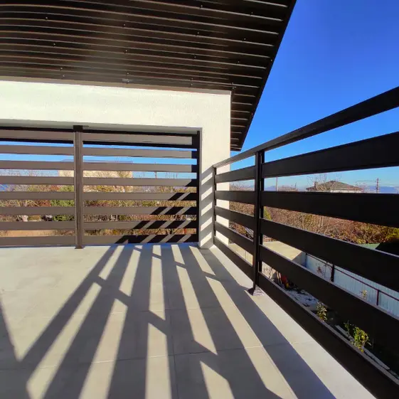 Стильное и практичное решение для загородного дома — ограждение террасы и веранды, выполненное из металлопланкена в покрытии RAL8019 МАТТЕ Тёмный Шоколад и ламелей Еврожалюзи. Матовая поверхность придаёт конструкции современный и аккуратный вид, а глубокий оттенок гармонично сочетается с архитектурой частного дома. Использование металлопланкена на перилах балкона не только подчёркивает эстетику фасада, но и обеспечивает долговечность и устойчивость к воздействию погодных условий. Такой вариант отделки перил балкона удачно объединяет надёжность, низкие требования к уходу и привлекательный дизайн.